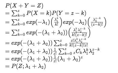 が和の分布となる(ポアソン分布の再生性が確認できた)。よって、和の分布は