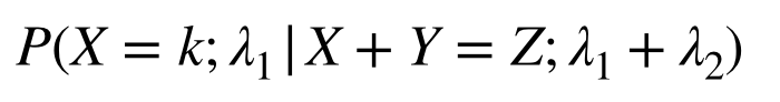 となるので、この条件付き確率分布は二項分布となる。